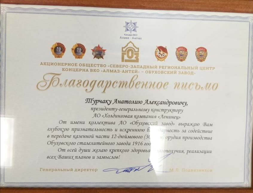 В адрес Анатолия Александровича Турчака поступило Благодарственное письмо от генерального директора АО "Обуховский завод" Михаила Львовича Подвязникова, в котором он выразил от имени коллектива предприятия глубокую признательность за содействие в передаче казенной части 12-дюймового орудия производства Обуховского сталелитейного завода 1916 года.