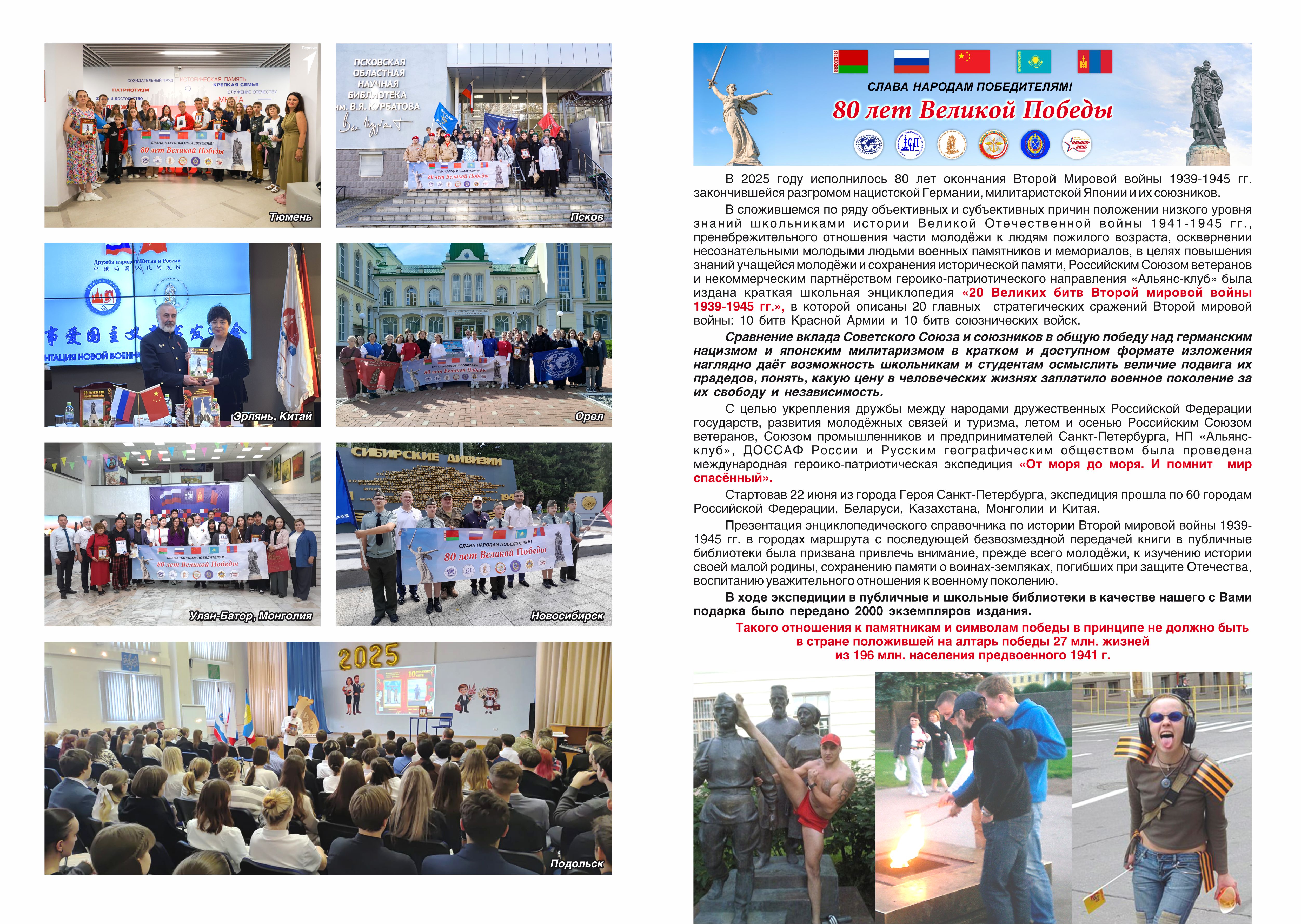 Экспедиция стартовала 19 июня 2025 года в городе Вологда, завершилась 26 октября 2025 года в Великом Новгороде. Позади 60 городов Российской Федерации, Казахстана, Монголии и Китая. По ходу экспедиции была презентована школьная энциклопедия «20 Великих битв Второй мировой войны 1939-1945 гг.». В книге школьникам рассказано о 10 главных битвах Красной Армии и 10 главных сражениях союзнических войск. Всего в публичные и школьные библиотеки было предано 2000 экз. издания.