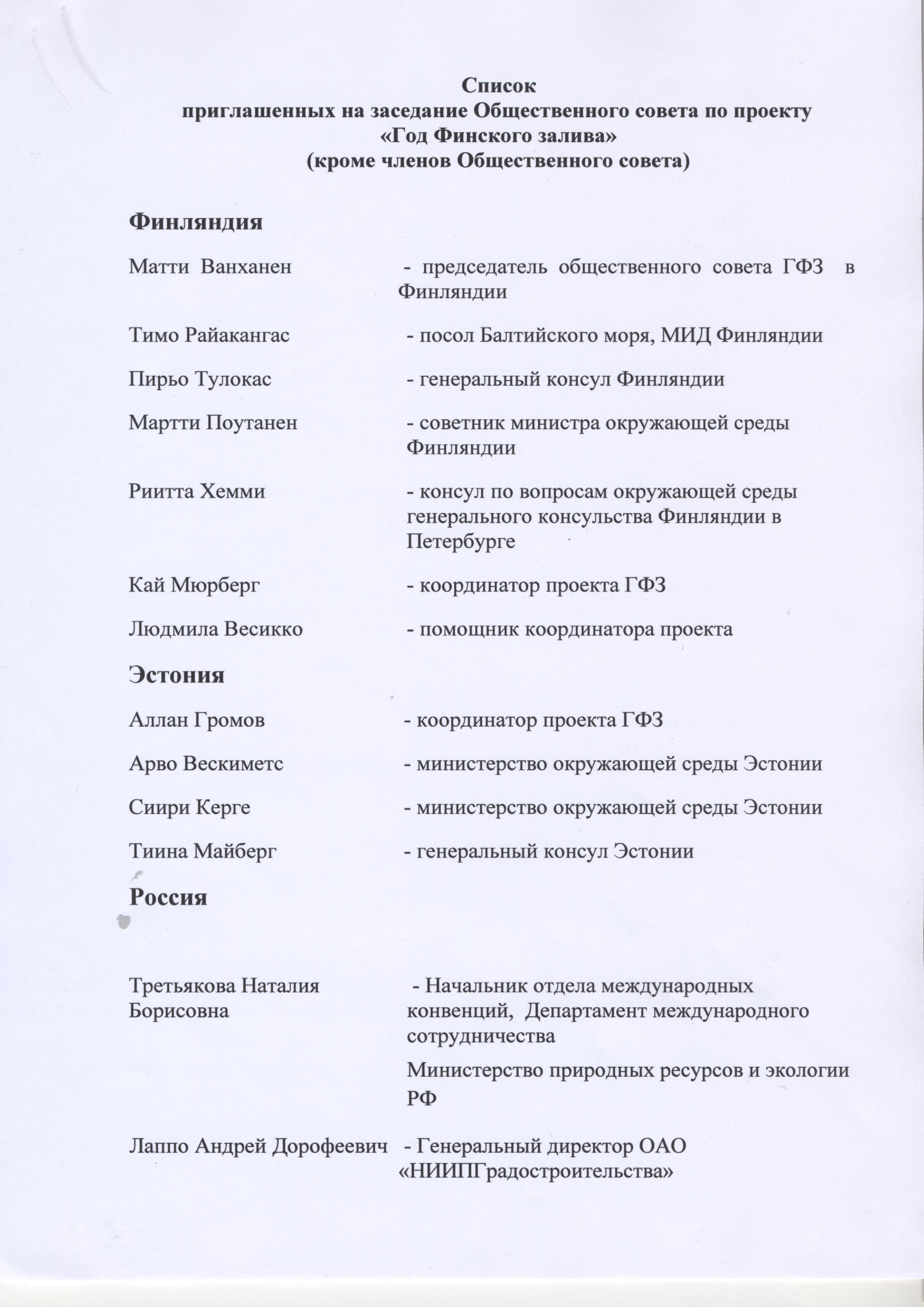 Для решения этой задачи создан Общественный совет по проведению Года Финского залива, сопредседателями которого стали губернатор Санкт-Петербурга Г.С. Полтавченко и губернатор Ленинградской области А.Ю. Дрозденко. В состав Общественного совета вошли президент ОО «Союз промышленников и предпринимателей Санкт-Петербурга», президент-генеральный конструктор ХК «Ленинец» А.А.Турчак, художественный руководитель Мариинского театра В.А. Гергиев, директор Государственного Русского музея В.А.Гусев, директор Государственного Эрмитажа М.Б.Пиотровский, председатель Союза журналистов Санкт-Петербурга и Ленинградской области Л.Д.Фомичева, генеральный директор ГУП «Водоканал Санкт-Петербурга» Ф.В.Кармазинов, член Морского совета при губернаторе Санкт-Петербурга В.Я.Ходырев, вице-президент Союза промышленников и предпринимателей Санкт-Петербурга, член правления Ленинградской торгово-промышленной палаты Ю.В.Трусов, представители промышленности, общественных организаций, исполнительной и законодательной власти и т.д.